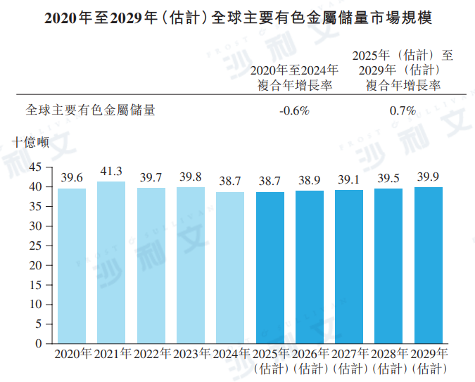 全球主要有色金属储量是指主要有色金属的具备经济可开采的数量,即在当前技术经济条件下被认定可开采的主要有色金属数量。全球主要有色金属储量于过往年度保持相对稳定。2020年至2024年,全球主要有色金属储量由396亿吨减少至387亿吨,复合年增长率为-0.6%。该减少可能归因于疫情后复苏期间产业消耗加速、供应链中断及矿产勘探投资不足。展望未来,受全球对南美、非洲等资源富集地区勘探活动的稳定投入,以及深地成像、遥感等地质勘探技术的进步推动,全球主要有色金属储量到2029年有望增至399亿吨,2025年至2029年的复合年增长率为0.7%。