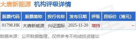截至2026年1月12日收盘,大唐新能源(01798.HK)报收于2.05港元,与上一交易日持平,成交量1209.89万股,成交额2471.69万港元。投行对该股的评级以增持为主,近90天内共有1家投行给出增持评级。兴证国际最新一份研报给予大唐新能源增持评级。