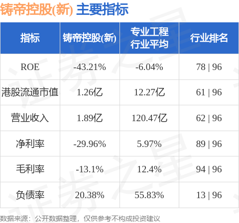 铸帝控股(新)港股市值1.26亿港元,在专业工程行业中排名第61。主要指标见下表: