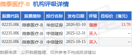 截至2026年1月13日收盘,微泰医疗-B(02235.HK)报收于7.68港元,上涨1.59%,成交量23.98万股,成交额184.54万港元。投行对该股的评级以买入为主,近90天内共有2家投行给出买入评级,近90天的目标均价为13.7港元。华创证券最新一份研报给予微泰医疗-B强推评级,目标价13.7港元。