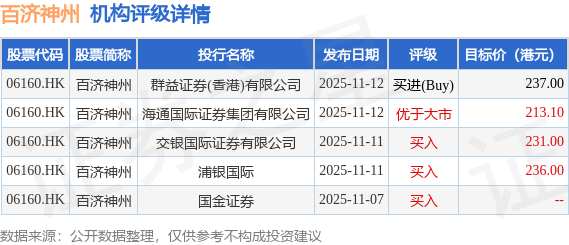 投行对该股的评级以买入为主,近90天内共有3家投行给出买入评级,近90天的目标均价为229.28港元。群益证券(香港)有限公司最新一份研报给予百济神州买进(Buy)评级,目标价237港元。