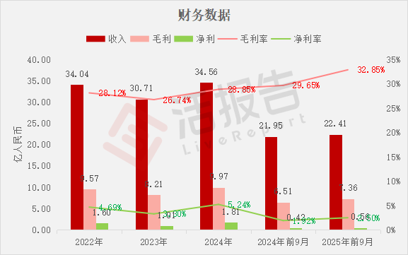 ,毛利率28.85%;2025年前9个月收入22.41亿元,净利润0.56亿元,同比增长