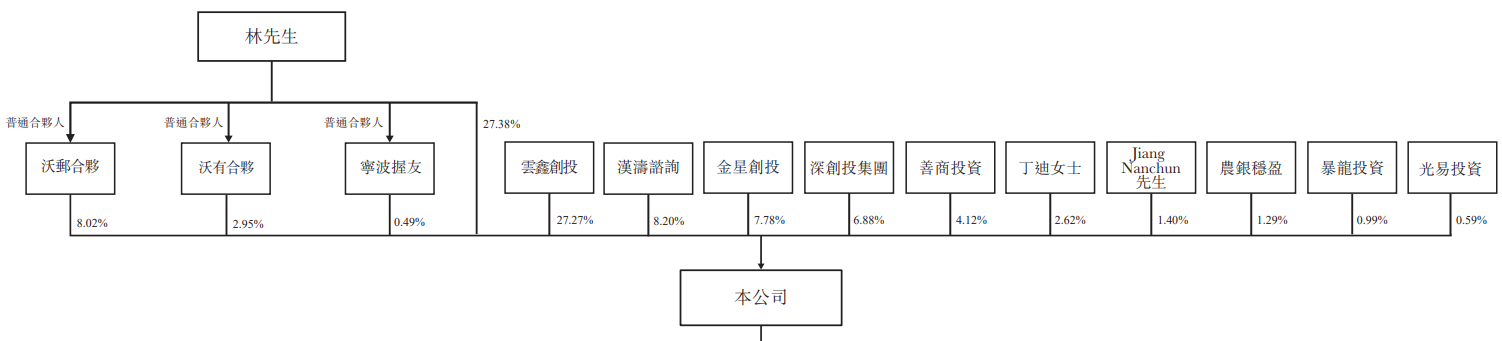 林先生持股27.38%,通过沃邮合伙、沃有合伙、宁波握友分别持股8.02%、2.95%、0.49%;