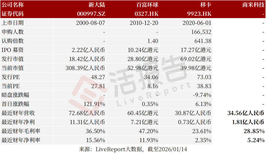 IPO可比公司:新大陆(000997.SZ)、百富环球(0327.HK)、移卡(9923.HK)
