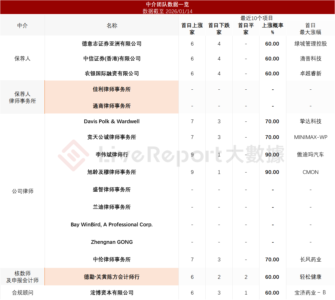 中介团队共计16家,其中保荐人3家,近10家保荐项目数据表现普通;公司律师共计9家,综合项目数据表现尚可。整体而言中介团队历史数据表现中规中矩。
