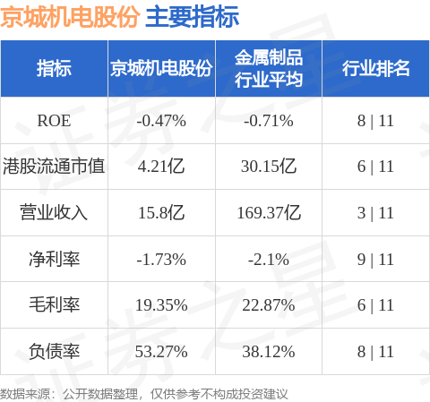 京城机电股份港股市值4.21亿港元,在金属制品行业中排名第6。主要指标见下表: