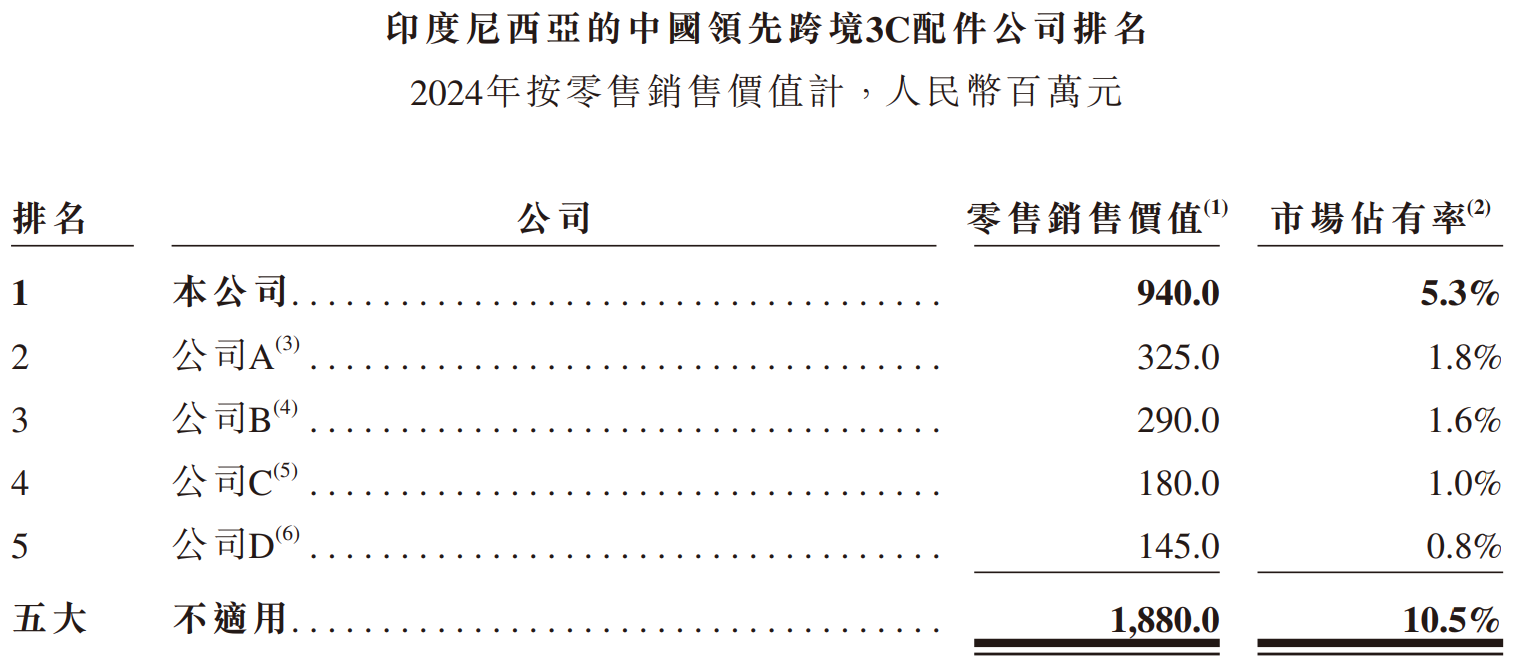 2024年,向印度尼西亚出口3C配件的五大中国企业的零售销售价值合计达约人民币1,880.0百万元,占中国与印度尼西亚3C配件出口市场份额约10.5%