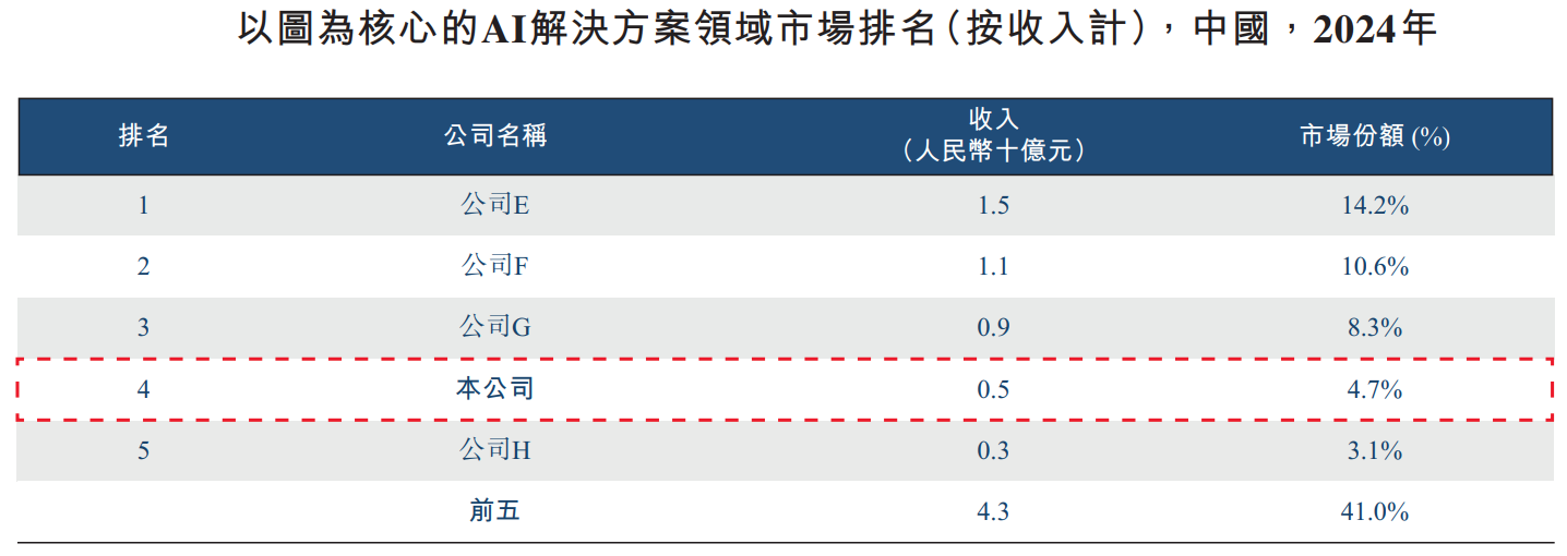 从细分市场来看,2024年以图为核心的AI解决方案领域市场规模约为人民币100亿元。就竞争格局而言,该市场拥有约30名参与者,包括大型互联网公司及成长迅速的科技公司。2024年,公司按收入计位列前五大公司