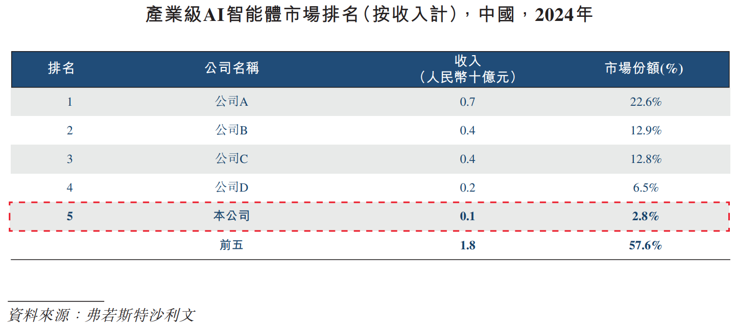在中国产业级AI智能体提供商中位列第五,市场份额为2.8%;并在中国以图为核心的AI智能体提供商中位列第一,市场份额约50%