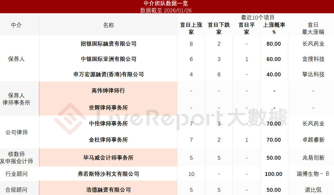 据LiveReport大数据统计,海致科技中介团队共计10家,其中保荐人3家,近10家保荐项目数据表现普通;公司律师共计2家,综合项目数据表现尚可。整体而言中介团队历史数据表现中规中矩。