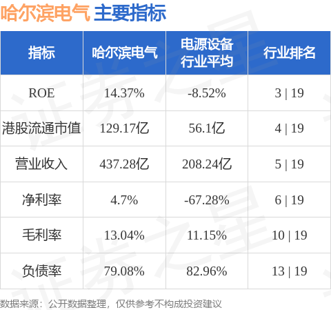 哈尔滨电气港股市值129.17亿港元,在电源设备行业中排名第4。主要指标见下表: