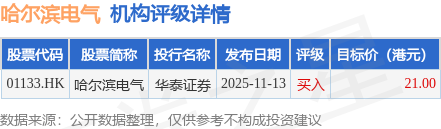 投行对该股的评级以买入为主,近90天内共有1家投行给出买入评级,近90天的目标均价为21港元。华泰证券最新一份研报给予哈尔滨电气买入评级,目标价21港元。