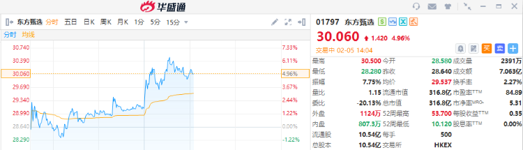 东方甄选午后涨近5%,绩后累计涨幅近40%。截至发稿,报30.06港元,成交额7.063亿港元。