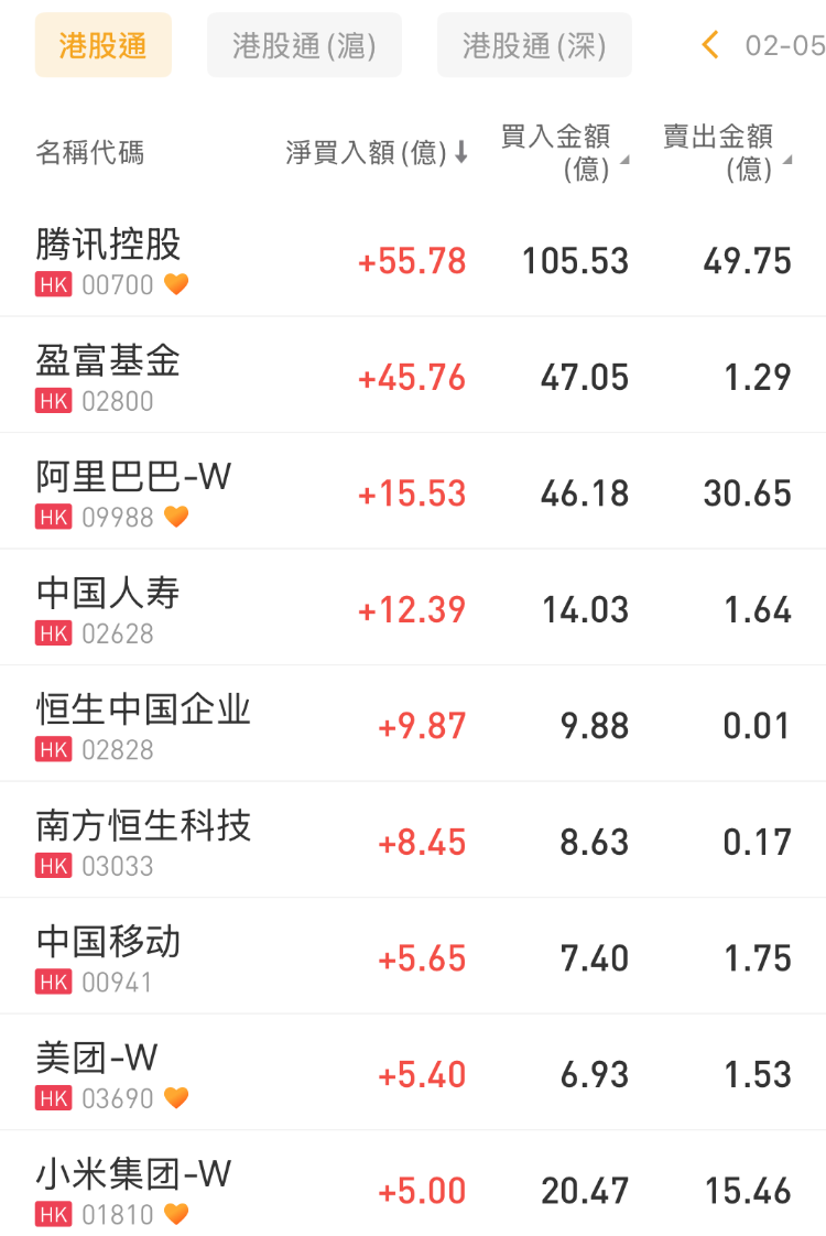 2月5日港股市场,北水成交净买入249.77亿港元,其中港股通(沪)成交净买入124.81亿港元,港股通(深)成交净买入124.96亿港元。