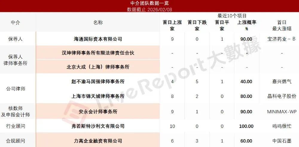 据LiveReport大数据统计,彤程新材中介团队共计8家,其中保荐人1家,近10家保荐项目数据表现良好;公司律师共计2家,综合项目数据表现不一。整体而言中介团队历史数据表现尚可。