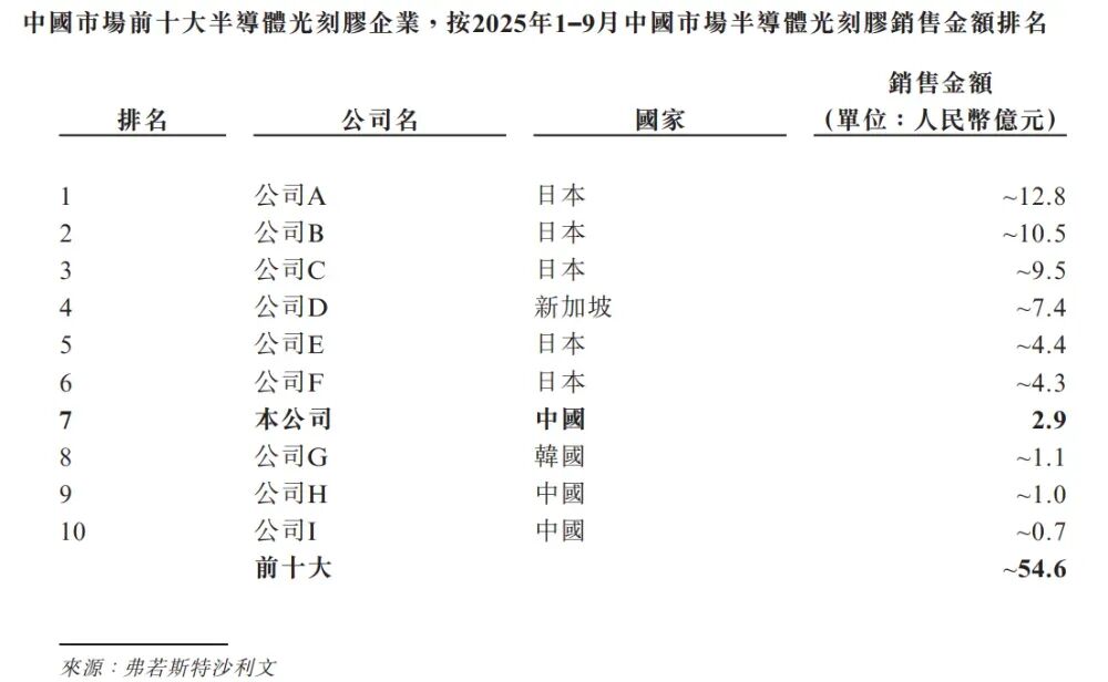 在中国市场,公司于2025年1-9月的半导体光刻胶销售额排名第七,并且为中国市场半导体光刻胶销售金额第一的本土公司。