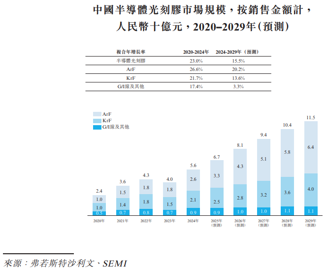 的报告,中国半导体光刻胶市场的销售金额从2020年的人民币24亿元增长至2024年的人民币56亿元,复合年增长率为23.0%,预计2029年将达到人民币115亿元,期间复合年增长率为15.5%。