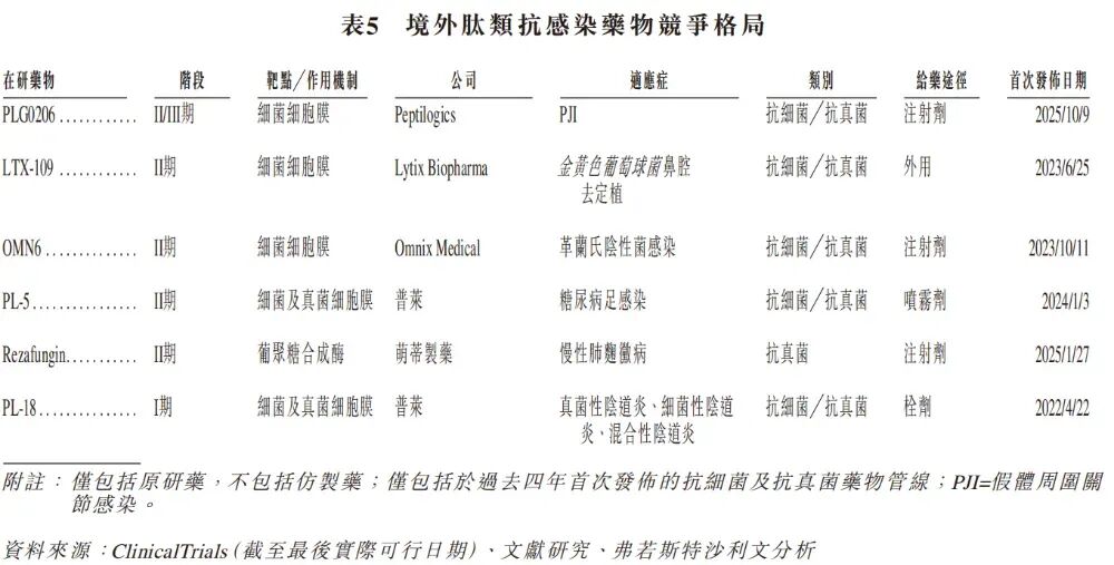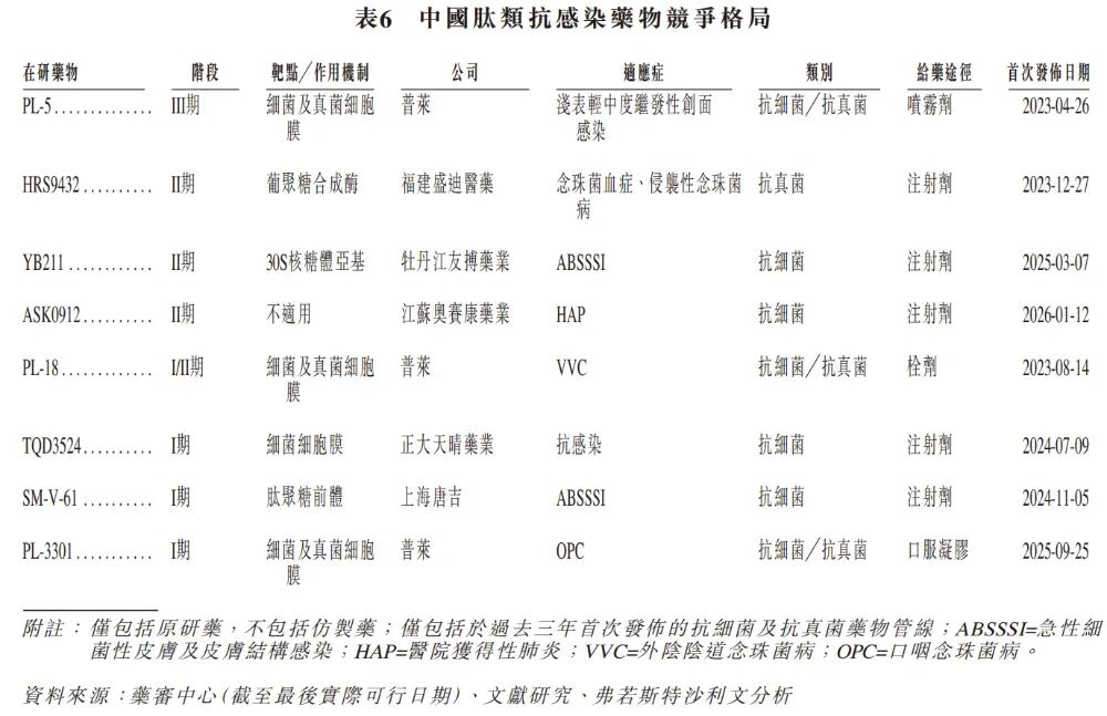 截至最后实际可行日期,有6种处于临床阶段的肽类抗感染候选药物正在开发中,而在中国有8种肽类抗感染候选药物正在开发中。