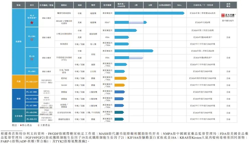 有九种候选药物,包括一种核心产品(即PL-5)及两种主要产品(即PL-3301及PL-18)。