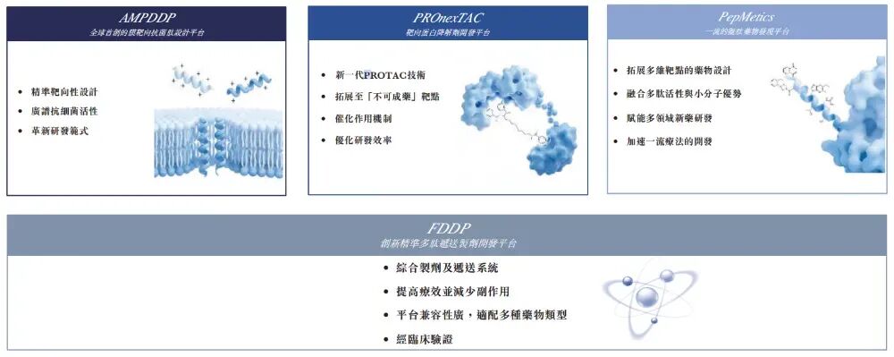 的研究与开发(“研发”)提供重要支持的技术平台:基于膜靶向机制的抗菌肽从头设计平台(“AMPDDP”)、基于PROTAC的靶向蛋白降解剂发现平台(“PROnexTAC”)、基于新机制的拟肽发现与开发平台(“PepMetics”)及创新型肽制剂多元化开发及精准递送平台(“FDDP”)。