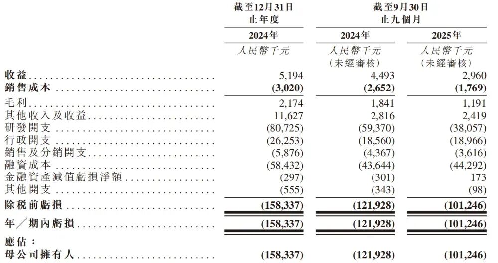 净利分别约为人民币-1.58亿、-1.22亿、-1.01亿,2025年前9月同比-16.96%;