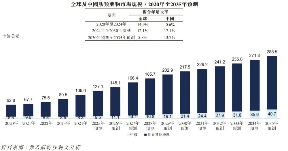 的报告,全球多肽药物市场规模持续增长,从2020年的628亿美元增至2024年的1,096亿美元。预计全球多肽药物市场规模于2030年至2035年间将按5.8%的复合年增长率增长,于2035年增至2,885亿美元。