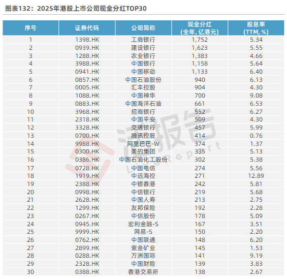 此外,2025年港股市场分红金额近1.5万亿港元,其中“分红最慷慨”的上市公司包括工农中交建、中国移动、中国石油、中国中铁、汇丰控股、腾讯控股、阿里巴巴、比亚迪股份等公司,股息率普遍超过5%,多的甚至可达10%以上。