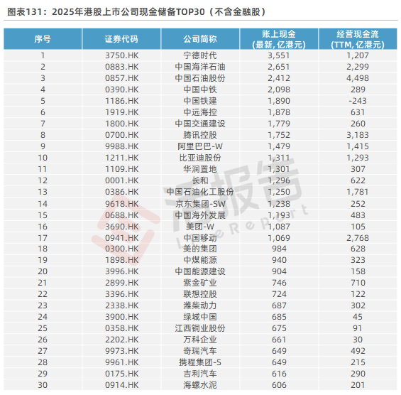 2025年港股上市公司合计现金储备达40.8万亿港元。不计金融股,“现金大户”主要集中于能源、工业、信息技术、可选消费等领域的龙头企业,包括宁德时代、“两桶油”、中铁/铁建/交建、中远海控、腾讯控股、阿里巴巴、比亚迪股份等。
