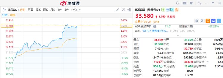潍柴动力午后走高,截至发稿涨超5%,报33.58港元,成交额6.24亿港元。