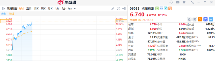 鸿腾精密再涨超12%,截至发稿,报6.74港元,成交额4.323亿港元。