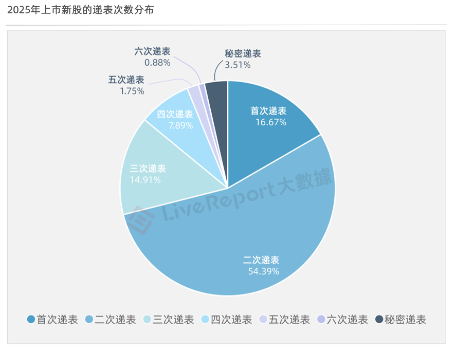 2025年上市的新股中,递表次数高达5次及以上的公司分别为纽曼思(6次)、量化派(5次)、绿茶集团(5次)。