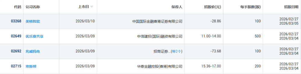 兆威机电(AH)、埃斯顿(AH)、优乐赛共享、美格智能(AH),预计将于3月初先后