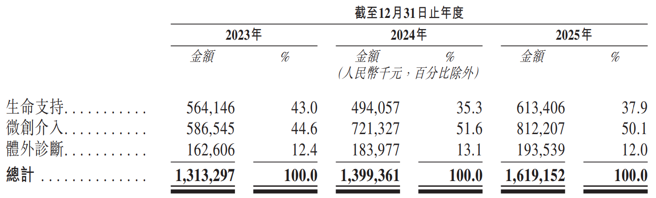 三大业务,其中微创介入业务是核心收入来源,2025年该板块收入占比超过一半,且持续增长。