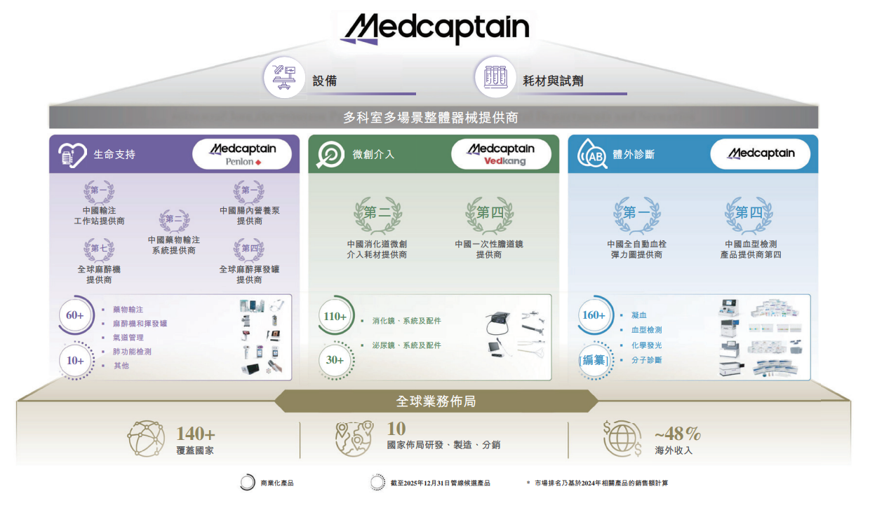 截至2025年12月31日,公司的产品组合包括超过(i)60种生命支持产品,(ii)110种微创介入产品,及(iii)160种体外诊断产品
