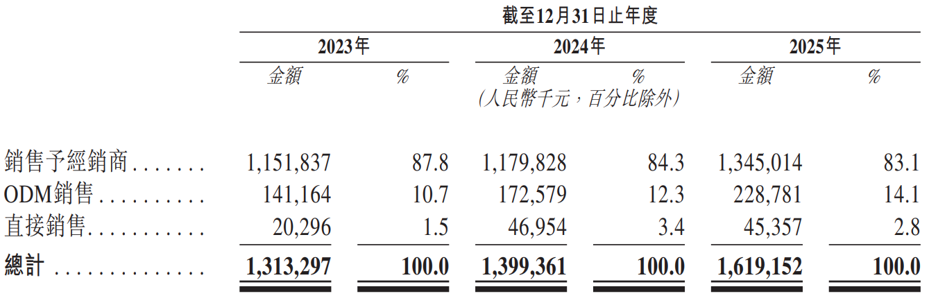 ,占比始终在80%以上,ODM销售占比逐年提升至14.1%,而直接销售仅维持在2%-3%左右。