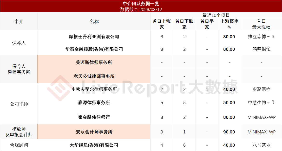 据LiveReport大数据统计,麦科田中介团队共计9家,其中保荐人2家,近10家保荐项目数据表现良好;公司律师共计3家,综合项目数据表现有待提升。整体而言中介团队历史数据表现中规中矩。