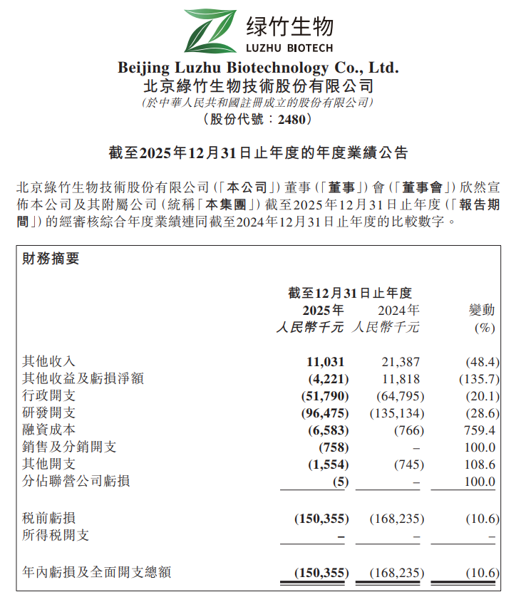 3月18日,绿竹生物-B(2480.HK)公布2025年度业绩公告。