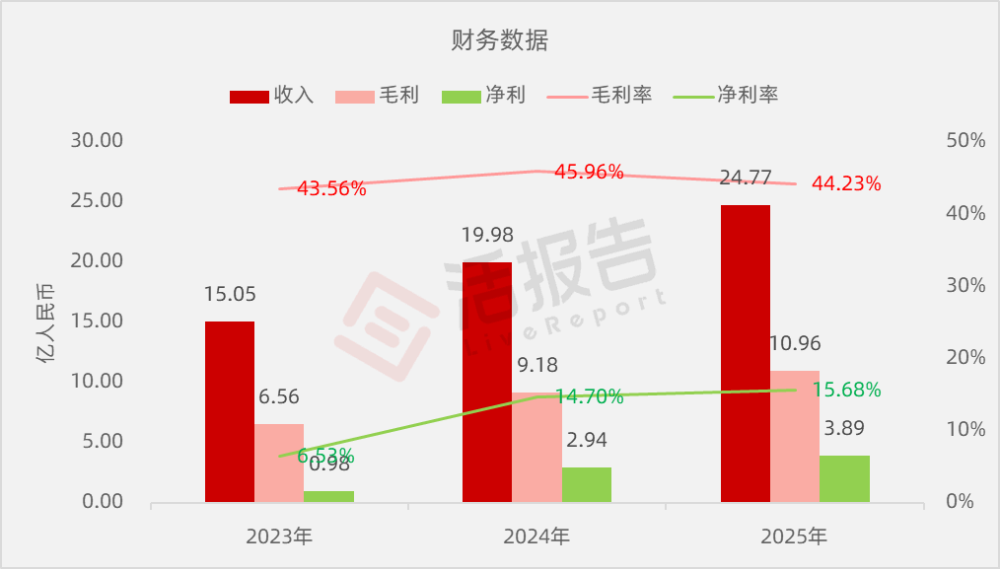 2023-2025年度,公司收入分别约为人民币15.05亿、19.98亿、24.77亿,2025年同比+23.99%;净利分别约为人民币0.98亿、2.94亿、3.89亿,2025年同比+32.26%;