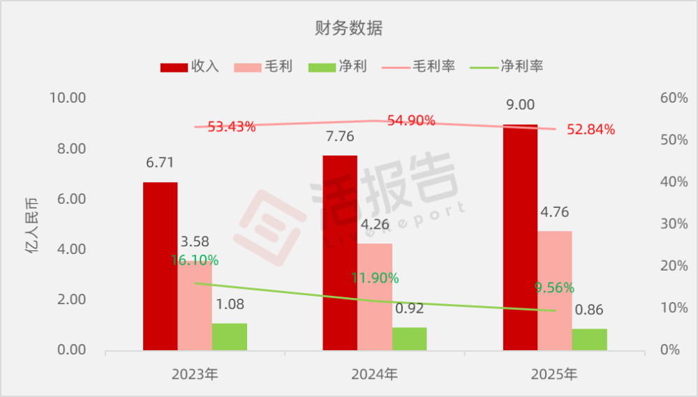 收入分别约为人民币6.71亿、7.76亿、9.00亿,2025年同比+16.04%;净利分别约为人民币1.08亿、0.92亿、0.86亿,2025年同比-6.74%;毛利率分别约为53.43%、54.90%、52.84%