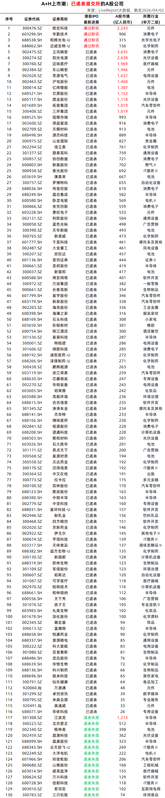 据LiveReport大数据统计,目前正在排队香港上市的A股公司达约130家。其中,胜宏科技、华勤技术、和辉光电、迈威生物已通过聆讯,或很快上市;还有120多家公司已递表港交所。