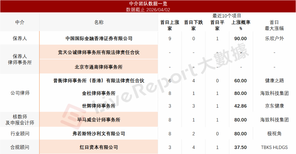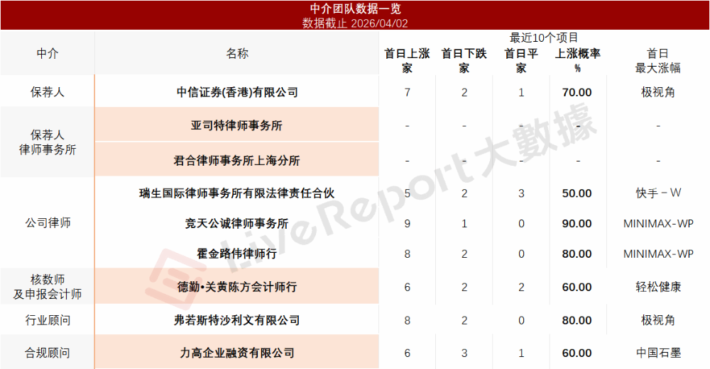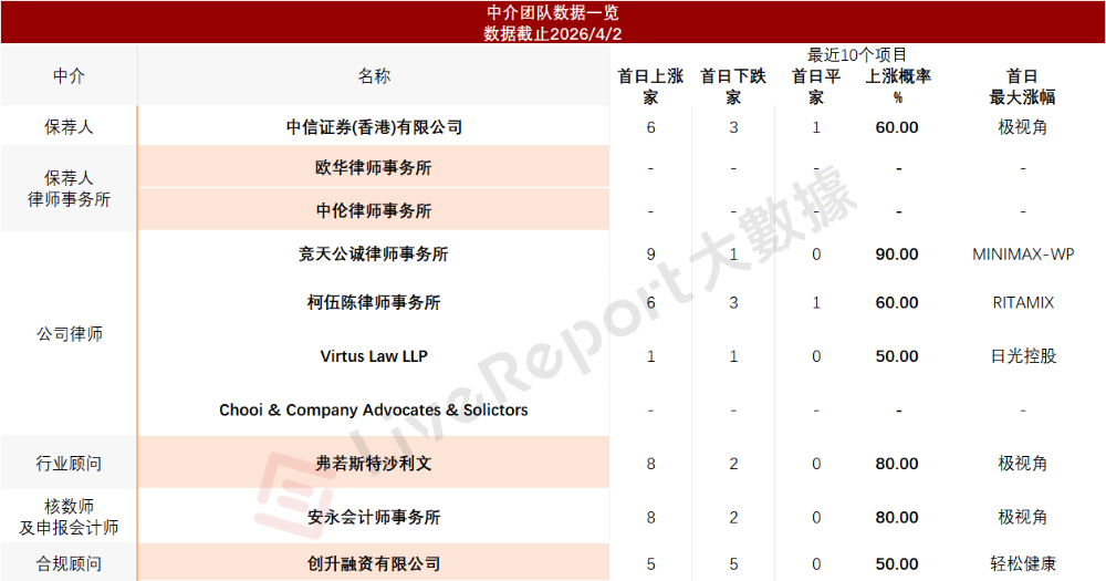 据LiveReport大数据统计,潮宏基中介团队共10家,其中保荐人1家,近10家保荐项目数据表现不错;公司律师共计4家,综合项目数据表现良好。整体而言中介团队表现有一定优势。