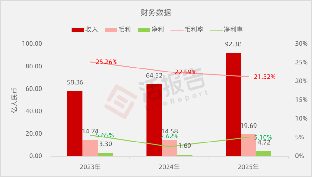 收入分别约为人民币58.36亿、64.52亿、92.38亿,2025年同比+43.17%;净利分别约为人民币3.30亿、1.69亿、4.72亿,2025年同比+178.74%;毛利率分别约为25.26%、22.59%、21.32%