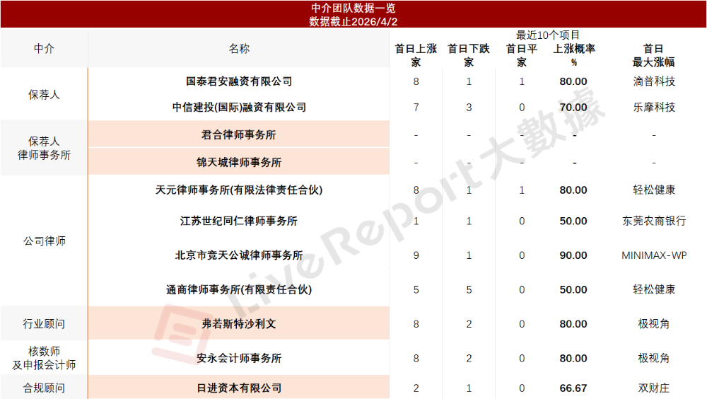 据LiveReport大数据统计,普源精电中介团队共计9家,其中保荐人1家,近10家保荐项目数据表现较好;公司律师共计3家,综合项目数据表现不一。整体而言中介团队历史数据表现尚可。