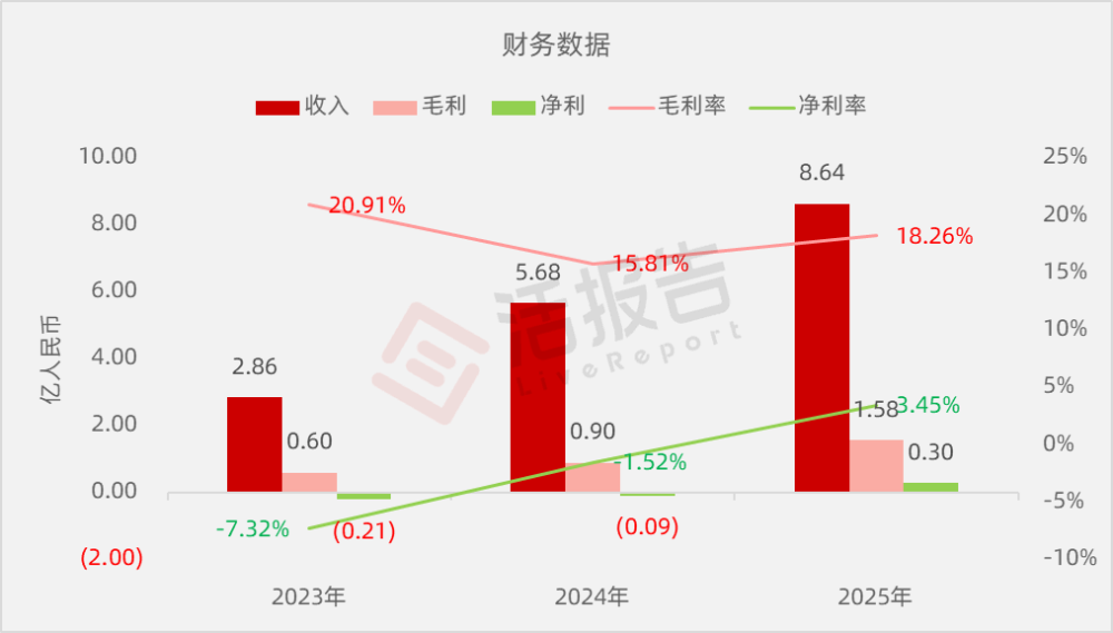 收入分别约为人民币2.86亿、5.68亿、8.64亿,2025年同比+52.17%;净利分别约为人民币-0.21亿、-0.09亿、0.30亿,2025年同比