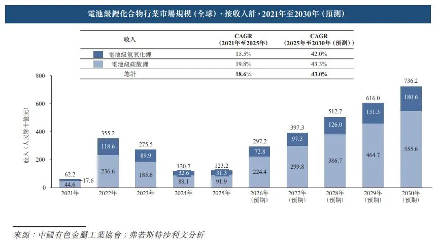 的报告,按收入计,全球电池级锂化合物行业的市场规模从2021年的人民币622亿元增长至2025年的人民币1,232亿元,CAGR为18.6%。2025年,按收入计的全球电池级氢氧化锂与全球电池级碳酸锂市场规模分别达到人民币313亿元及人民币919亿元,2021年至2025年的CAGR分别为15.5%和19.8%。