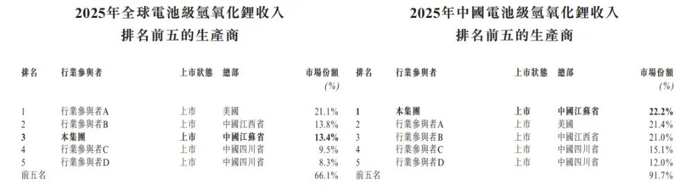 按2025年中国电池级氢氧化锂收入计,中国前五大制造商合计占比91.7%,