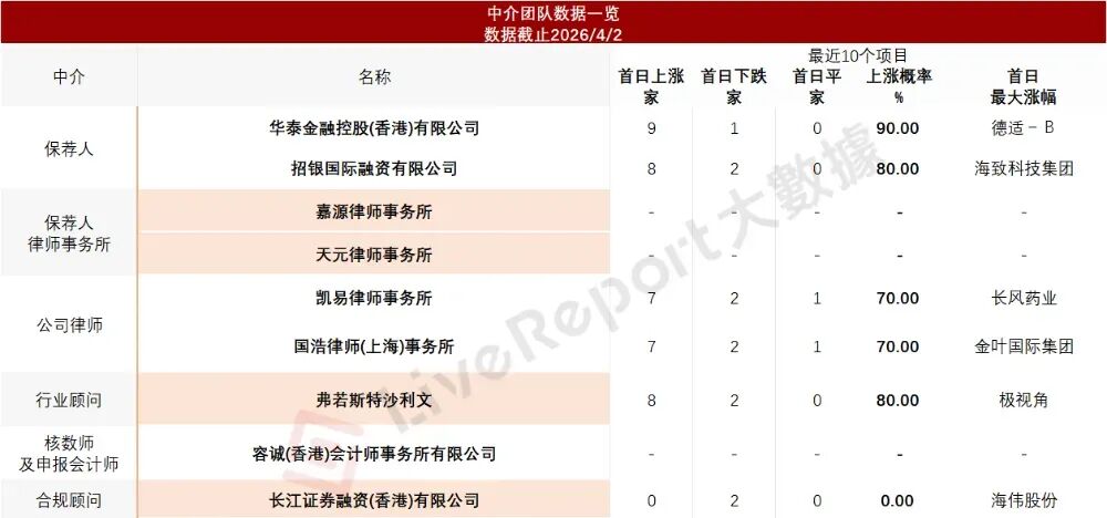 据LiveReport大数据统计,潮宏基中介团队共9家,其中保荐人2家,近10家保荐项目数据表现出色;公司律师共计2家,综合项目数据表现不错。整体而言中介团队表现令人印象深刻。