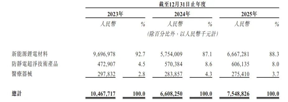 从三个主要业务分部产生收入:(i)新能源锂电材料,主要包括锂化合物产品;(ii)防静电超净技术产品;及(iii)医疗器械,主要包括注射器。