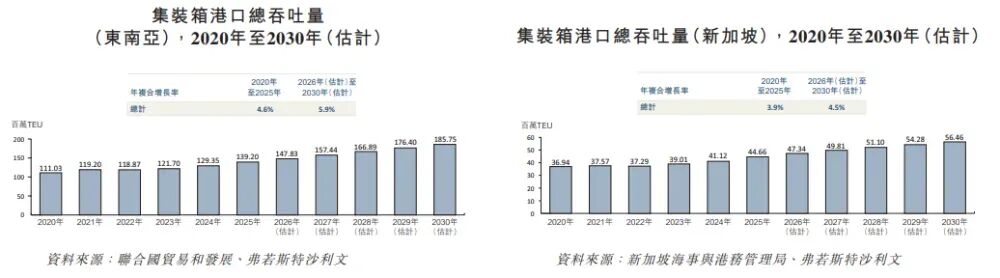 的报告,东南亚的集装箱港口吞吐量由2020年的111.03百万个TEU增加至2025年的 139.20百万个TEU,年复合增长率为4.6%。在该地区中,新加坡到2025年将占总吞吐量的44.66百万个TEU。区域扩张主要受“中国加一”制造业转移至越南和马来西亚等枢纽的趋势带动,同时亦得益于新加坡在应对全球供应链中断方面所扮演的角色。