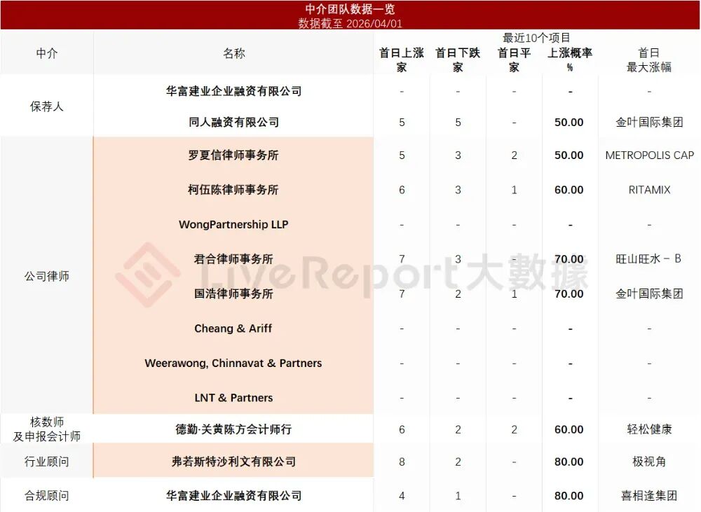 据LiveReport大数据统计,永康控股中介团队共计13家,其中保荐人2家,近10家保荐项目数据表现不理想;公司律师共计8家,综合项目数据表现普通。整体而言中介团队历史数据表现平平。